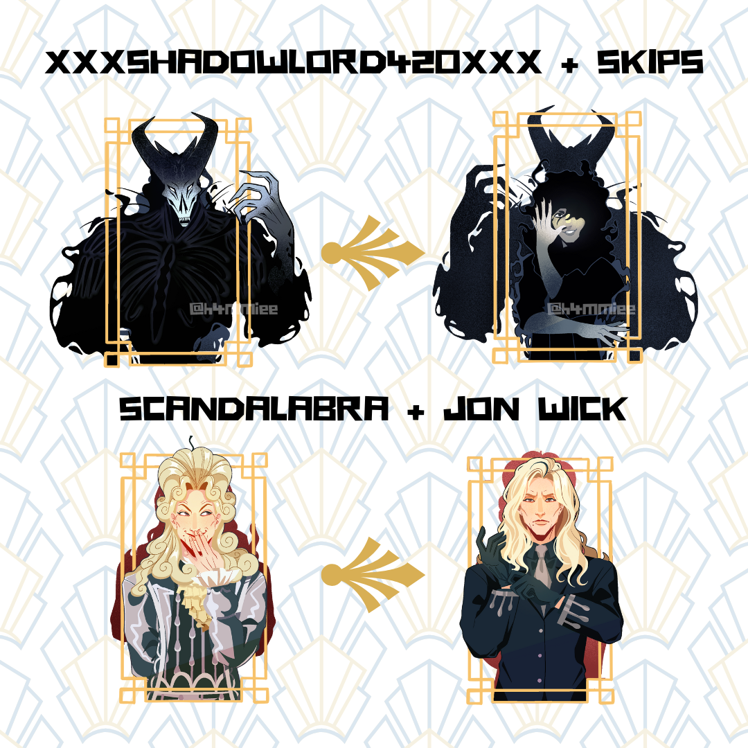 Most charms are double sided (same design on both sides) -- Eddie + Volt, Dirk + Clarence, Scandalabra + Jon Wick, and Shadowlord + Skips are on the same keychain (with their silhouettes visible behind each other).